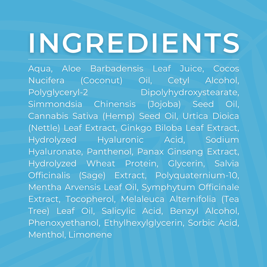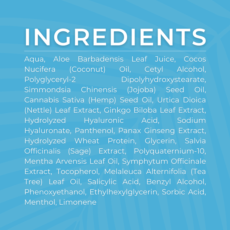 - Cannabis Sativa (Organic Hemp) Seed Oil & Simmondsia Chinensis (Jojoba) Oil: Deliver light, non-greasy hydration, augmenting the softness and manageability of hair.