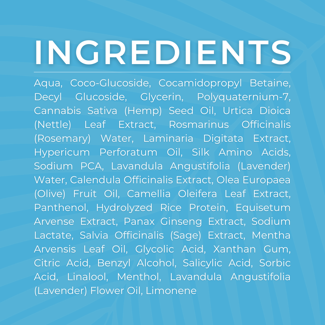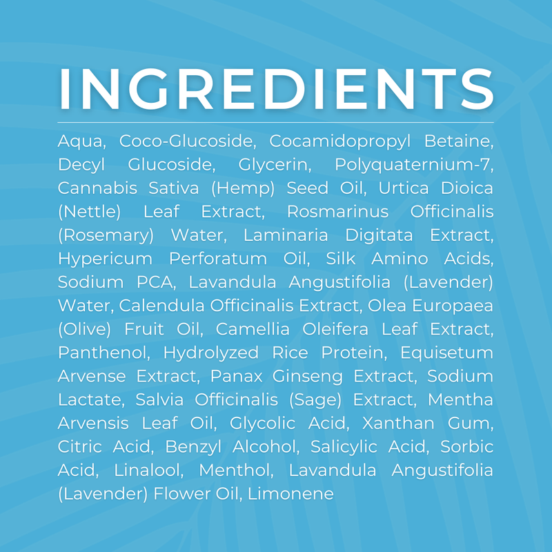 • Olea Europaea (Organic Olive) Oil & Cannabis Sativa (Organic Hemp) Seed Oil: Provide deep moisturization to the hair and scalp, leaving hair soft, supple, and more manageable without weighing it down.