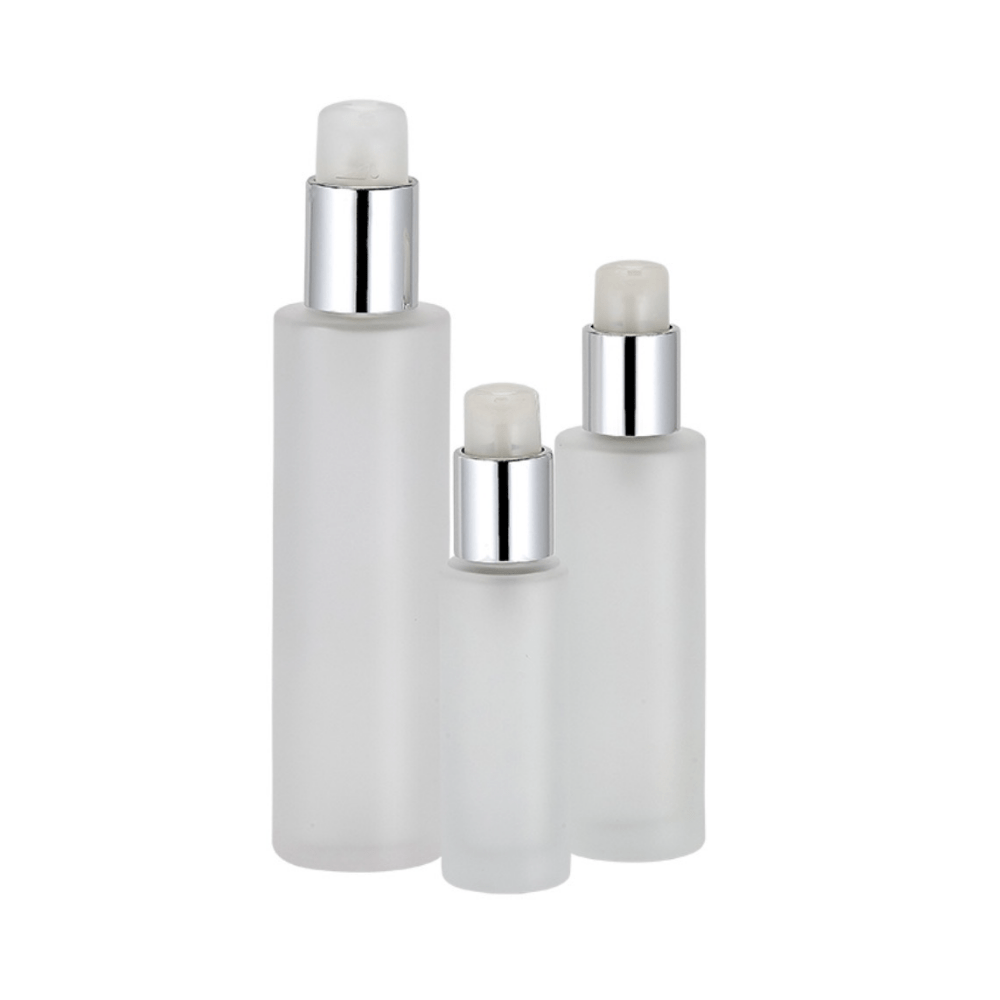 Premium glass frosted cylinder collection sample for private label, sophisticated frosted packaging for skincare.