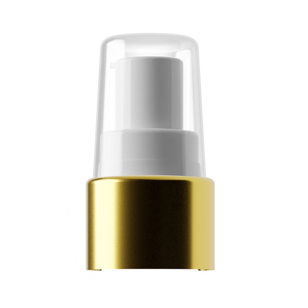 Shiny gold treatment pump sample for private label, elegant dispensing solution for serums and treatments.