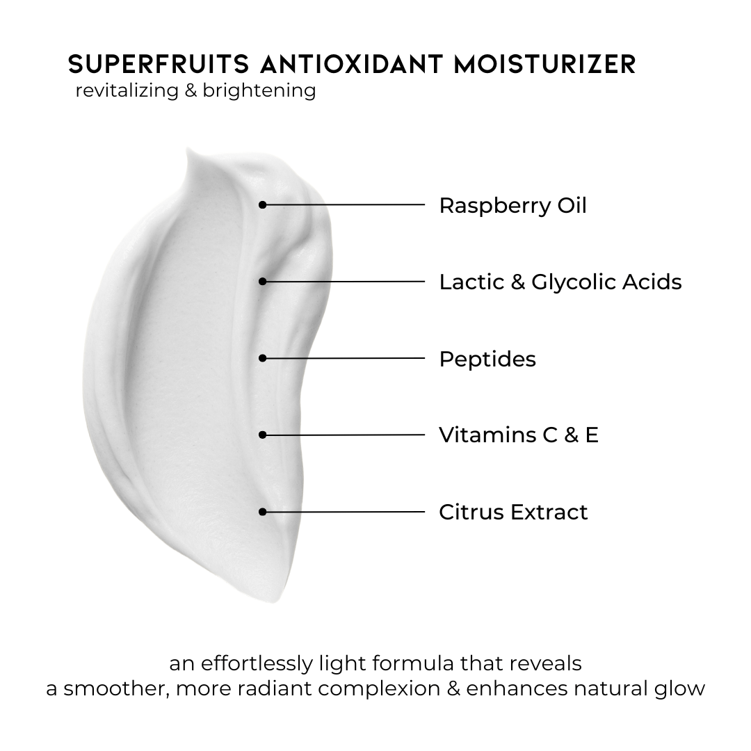 Every component in our Superfruits Antioxidant Moisturizer is meticulously selected for its role in delivering a symphony of skin benefits. Embrace the fusion of these elements working in concert to bestow the skin with unmatched hydration, protection, and a more youthful appearance.